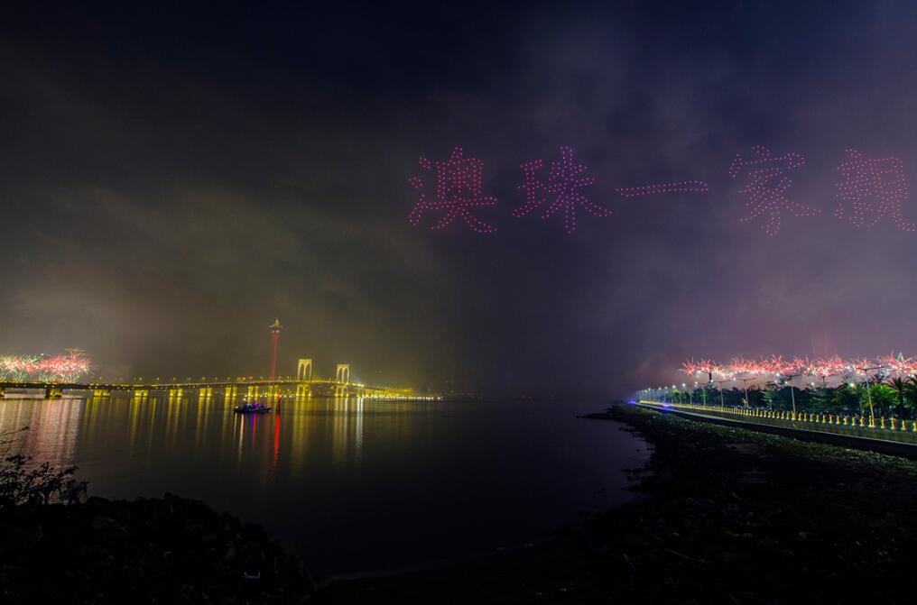 第三篇章「澳珠一家、鄰里情深」,伴隨著《浪漫珠海》的音樂聲中,無人機編隊組成的「珠海大劇院」在漫天焰火背景中驚艷亮相,猶如向海而生的「日月貝」,熠熠閃耀;隨後,無人機又在空中變成兩隻大手緊緊握在一起;伴隨著《澳門的對面是橫琴》的悠揚樂章, 「澳珠一家親」五個大字造型閃耀在璀璨夜空……澳門與珠海,就像兩束光簇擁在一起,熠熠初心照亮未來。