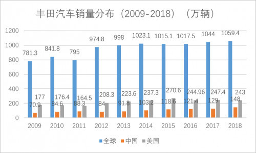 2009年,丰田在中国的销量是70.9万辆,十年后的2018年是148万辆,增幅达到了108.7%,2009年1-11月,丰田在华销量达到了129.4万辆。
