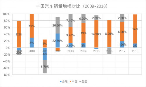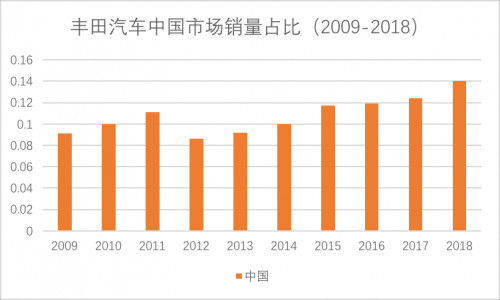 与之相对应的是,中国市场在丰田全球市场的销量占比也在逐年提升,从2009年的9.1%,上升到了2018年的14%。