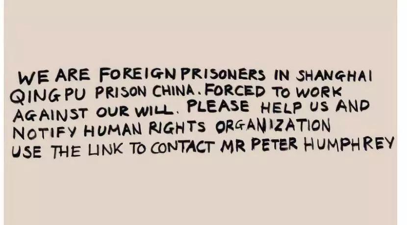 “我们是中国上海青浦监狱的一群外国人,被强迫劳动,违反了我们的意愿。请帮助我们通知人权机构,并联系Peter Humphrey先生”。