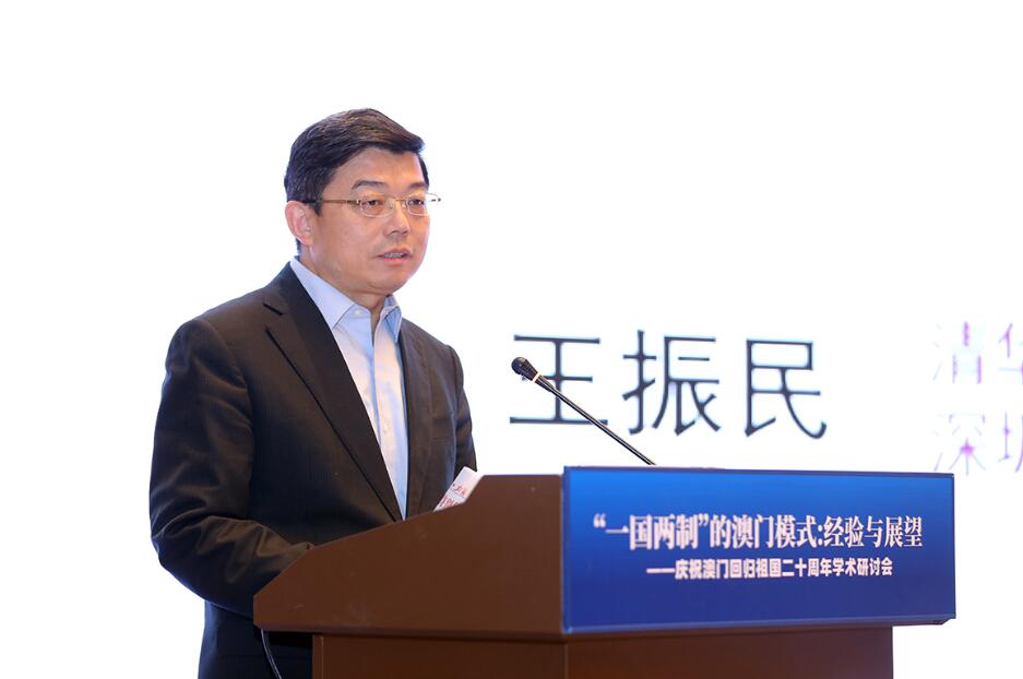 王振民表示,澳門回歸祖國20周年的成功實踐,說明「一國兩制」既是實現港澳回歸的一個最佳安排,也是港澳回歸之後保持長期繁榮穩定的最佳方案。他認為,「澳門回復後有一種主人翁意識。儘管地方很小,但澳門能充分利用珠海(橫琴)、廣東乃至內地的機會,堅守『一國』之本,非常堅定地融入國家發展大局、融入大灣區的發展。」他認為,無論是澳門還是香港,一旦與內地龐大的經濟體掛鈎,發展潛力無窮。
