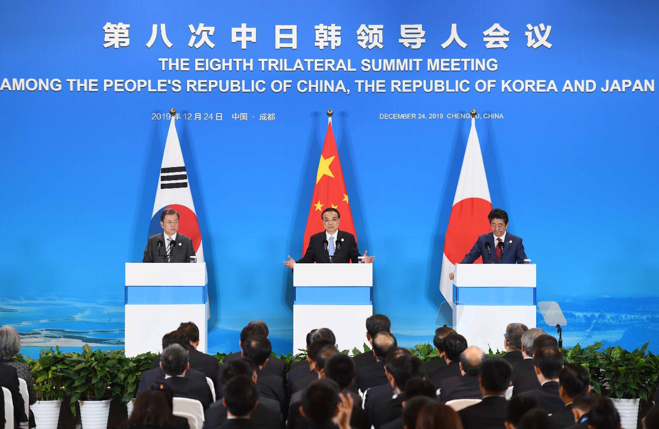 【香港商报网讯】值此中日韩合作20周年之际,中华人民共和国国务院总理李克强、日本国首相安倍晋三和大韩民国总统文在寅,于2019年12月24日在中国成都举行第八次中日韩领导人会议,回顾三国合作历程,展望未来合作前景。