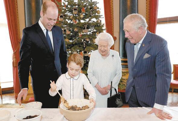 24日當天,英國王室還公布四世同堂做聖誕布丁的視頻。視頻中,6歲的喬治王子正在攪拌布丁配料,其身後站着37歲的父親威廉王子、71歲的祖父查理斯王子以及93歲曾祖母女皇伊利沙伯二世。查理斯、威廉及喬治分別是英國王位第一至第三順位繼承人。
