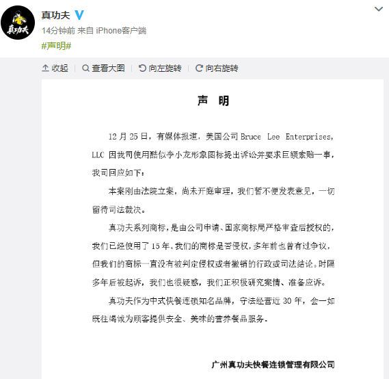 声明中还称:“真功夫系列商标,是由公司申请、国家商标局严格审查后授权的,已经使用了15年。时隔多年后被起诉,我们也很疑惑,正积极研究案情、准备应诉。”