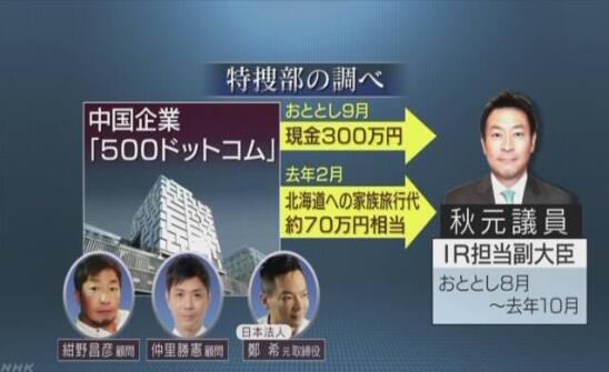 12月,秋元曾和自民党众议员白须贺贵树、自民党前众议员胜沼荣明拜访该公司位于深圳总部。两人的事务所均已被检方搜查。