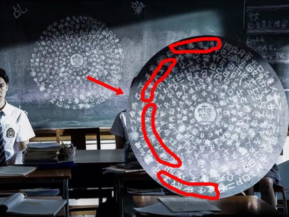 剧照中,演员们背后的黑板上,用文字砌出碟仙图案,其中暗藏着“黑警死全家”的辱警恶毒诅咒,以及香港示威者口中所谓的“光复香港时代革命”口号。同样的字符也出现在该单元剧的宣传海报上。