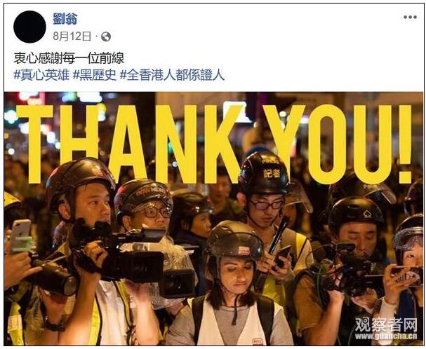 观察者网发现,刘翁在个人社交媒体上曾多次发表辱警言论,污蔑香港警队对市民行使暴力,转发抹黑警队的谣言;