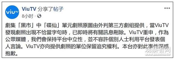 ViuTV是香港首富李嘉诚次子李泽楷公司旗下的免费电视频道,事后官博也迅速删除了海报并道歉,转发上述声明解释称涉事原图由第三方剧组提供,强调ViuTV保持平台中立性,保留向相关单位追究的权利。