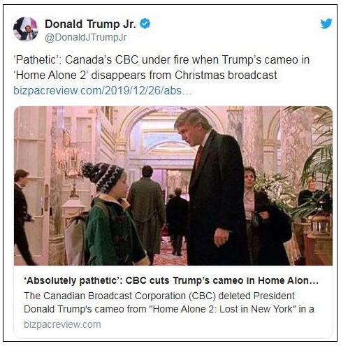 特朗普的大儿子也在推特上说,“可悲:特朗普在《小鬼当家2》中的客串镜头消失后,加拿大广播公司遭到炮轰。”