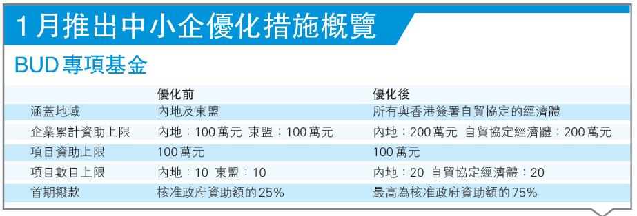 此外,「BUD專項基金」及「市場推廣基金」獲增加注資,將由1月20日起增加每家企業的累計資助上限和首期撥款比率,以及擴大「BUD專項基金」的資助地域範圍,以協助企業提升競爭力及拓展內地和海外市場。