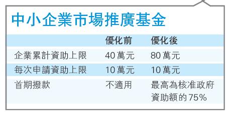 「市場推廣基金」從下月20日起,將每家中小企的累計資助上限由40萬元倍增至80萬元,以及中小企可以選擇申請高達核准政府資助額的75%作為首期撥款。