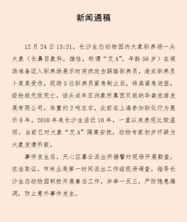 大象伤人致死事件发生后,长沙生态动物园第一时间向市林业局、辖区公安部门汇报,积极协助开展现场勘查等工作。