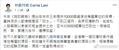 行政长官林郑月娥昨晚在社交媒体发文称,今年《施政报告》提出在未来3年提供10000个过渡性房屋单位的目标,当时很多人都怀疑是否「吹水」。《施政报告》提出至今不到3个月,各界反应热烈,包括私人发展商以象征式租金提供土地,至今约8000个过渡性房屋单位已到位。林郑月娥表示,相信经民、商、官通力合作,10000个过渡性房屋单位的目标达标在望。