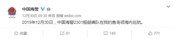 据@中国海警 12月30日消息:2019年12月30日,中国海警2301舰艇编队在我钓鱼岛领海内巡航。