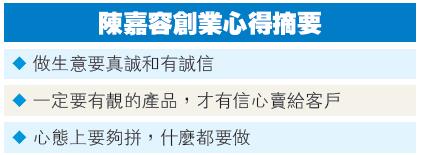 創業至今一年時間,雖然不算經驗豐富,但陳嘉容亦有自己的心得。「首先一定要有靚的產品,質量好的、自己認可的產品才有信心賣給客戶。如果產品不靚、質量不好,我連自己都沒法說服,產品亦好難推銷出去。質量差的產品過不到自己那關,做生意還是要真誠和誠信。此外,心態上要夠拼,什麼都要做。」陳嘉容總結到。