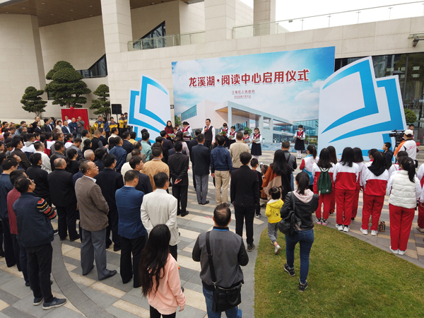儀式現場,彭章瑞、招文娟、湯惠紅、勞茂昌、餘志堅、何騰等領導為龍溪湖閱讀中心揭牌,見證閱讀中心正式對外開放。其後,出席嘉賓一同參觀龍溪湖閱讀中心,彭章瑞、招文娟、湯惠紅、勞茂昌等領導在二樓文化講座現場向學生代表進行贈書活動。