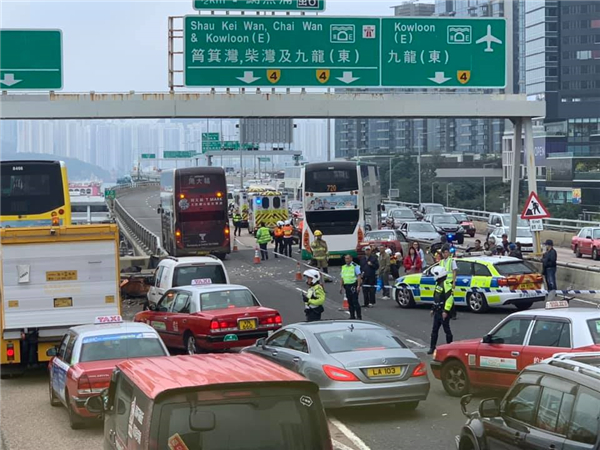 昨日上午11時12分,新巴車長楊×江(65歲)駕駛行走上環港澳碼頭至筲箕灣嘉亨灣的720線雙層巴士,沿東區走廊左2線東行,途至近北角糖水道時懷疑失控,先撞向左邊石壆,繼而再撞右邊石壆,尾隨駕駛的士的陳×澄(58歲),與另一輛私家車司機見狀扭?閃避,但仍收掣不及發生碰撞,有途經駕駛人士見狀代為報警。救護員到場替傷者包紮,分批送院治理,警方封閉東行行車線進行調查,現場交通嚴重受阻近2小時。