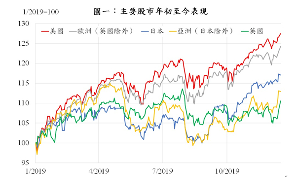 參考貨幣政策,雖然日本銀行曾表示寬鬆工具不限於減息,還有各種進一步寬鬆的措施選項,但會否及如何擴大資產購買目前還沒有定案,料觀望態度對日圓的影響有限。然而日圓作為傳統避險貨幣,若能預測今年大市走勢,應可見推測其前景。先總結一下去年全球主要股市表現,圖一顯示美股升幅超過兩成半,歐洲股市表現貼近,日股則跑贏亞洲股市,升幅也接近兩成,而英股在大選後才追落後。
