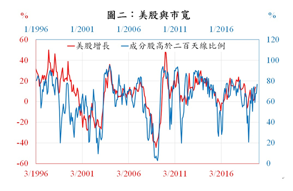 目前,中美貿易關係、英國脫歐前景及聯儲局貨幣政策漸見方向,市場投資情緒升溫,料risk-on將持續到今年初。參考美股市寬,圖二顯示其成分股高於二百天線比例與美股增長同向,前者領先後者兩個月。按藍線可見,目前接近八成美股成分股高於二百天線,料股市增長持續上升,今年2月按年升幅應接近兩成。