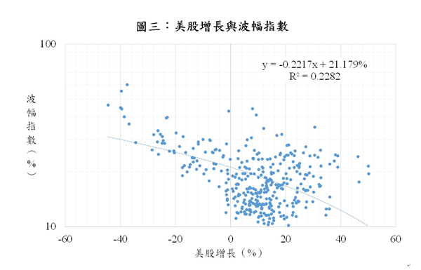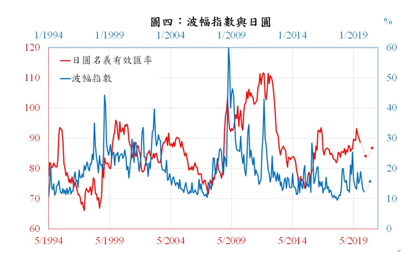 然而圖三顯示美股增長與波幅指數關係的散點圖,把上述結果套進回歸分析上,料波幅指數合理值於今年2月達16.7%。再把波幅指數對上日圓得出圖四,可見兩者整體同向,前者則領先後者四個月。其中波幅指數近月反覆回落,加上圖三得出的結論,雖然料在2月略回升至16.7%(藍箭),但仍與近年高位有一段距離,因此料日圓在未來四個月將持續回落,隨後才見小幅反彈。