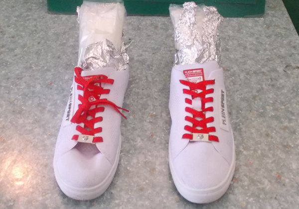 海關展示檢獲收藏在運動鞋內的懷疑氯胺酮。