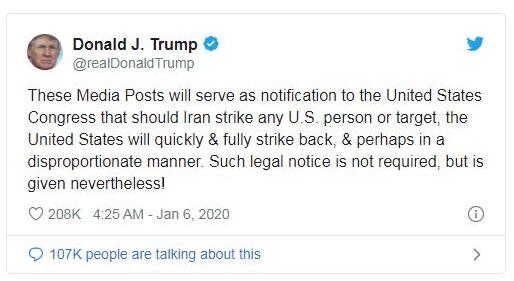 据The Verge新闻网站报道,当地时间1月6日,美国总统特朗普在个人推特账号上发帖称,“如果伊朗对美国公民或任何目标发动袭击,美国将迅速、全面予以反击,而且可能采取不成比例的动作。而(我的)这些帖子将作为给美国国会的通知。这些法律声明不是必须的,但仍然会发出!”美媒提到,就在该帖发布的前几天,特朗普刚刚因为未将军事行动通知国会一事遭到国内舆论强烈谴责。