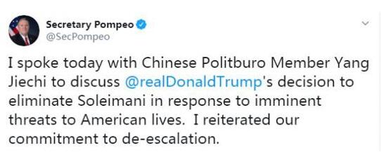 蓬佩奥3日除了给杨洁篪打电话,还同英国外交大臣兼首席大臣多米尼克·拉布和德国外长马斯通电话进行解释。法国总统马克龙同日则与普京通话,讨论了伊拉克局势。