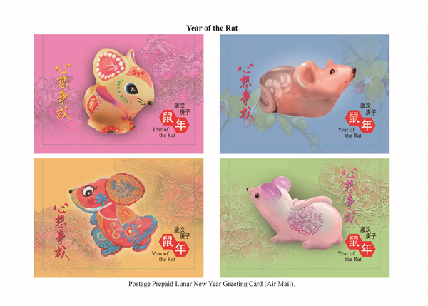 兩款心思心意郵票(2020年版)「歲次庚子(鼠年)」小版張分別以面值2元和4元9角的郵票設計。同日推出第二輯十二生肖金銀郵票系列的第八款郵票小型張──「寶豬巧鼠」,以銀箔燙印的豬年郵票配以嵌有22K鍍金金片的鼠年郵票,背景以橙紅色襯以絢麗的杜鵑花圖案,喜氣洋洋。