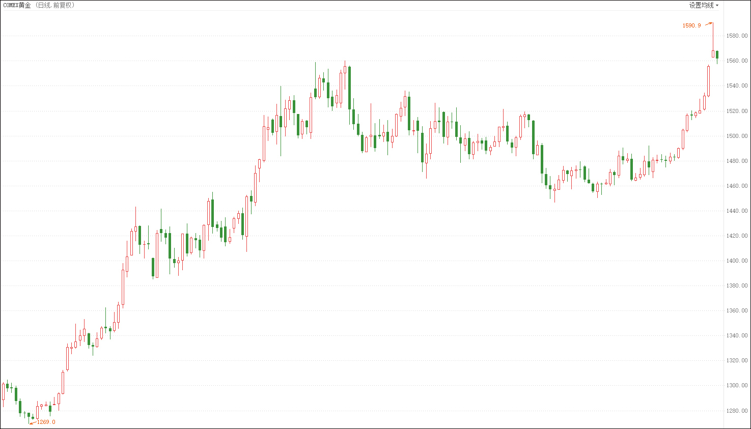 此外,国际现货黄金(伦敦金CFD)近日同样走出5连阳,6日收涨0.87%,报1565.59美元/盎司,盘中一度涨至1588.13美元/盎司,创近7年新高。目前暂报1559.19美元/盎司。