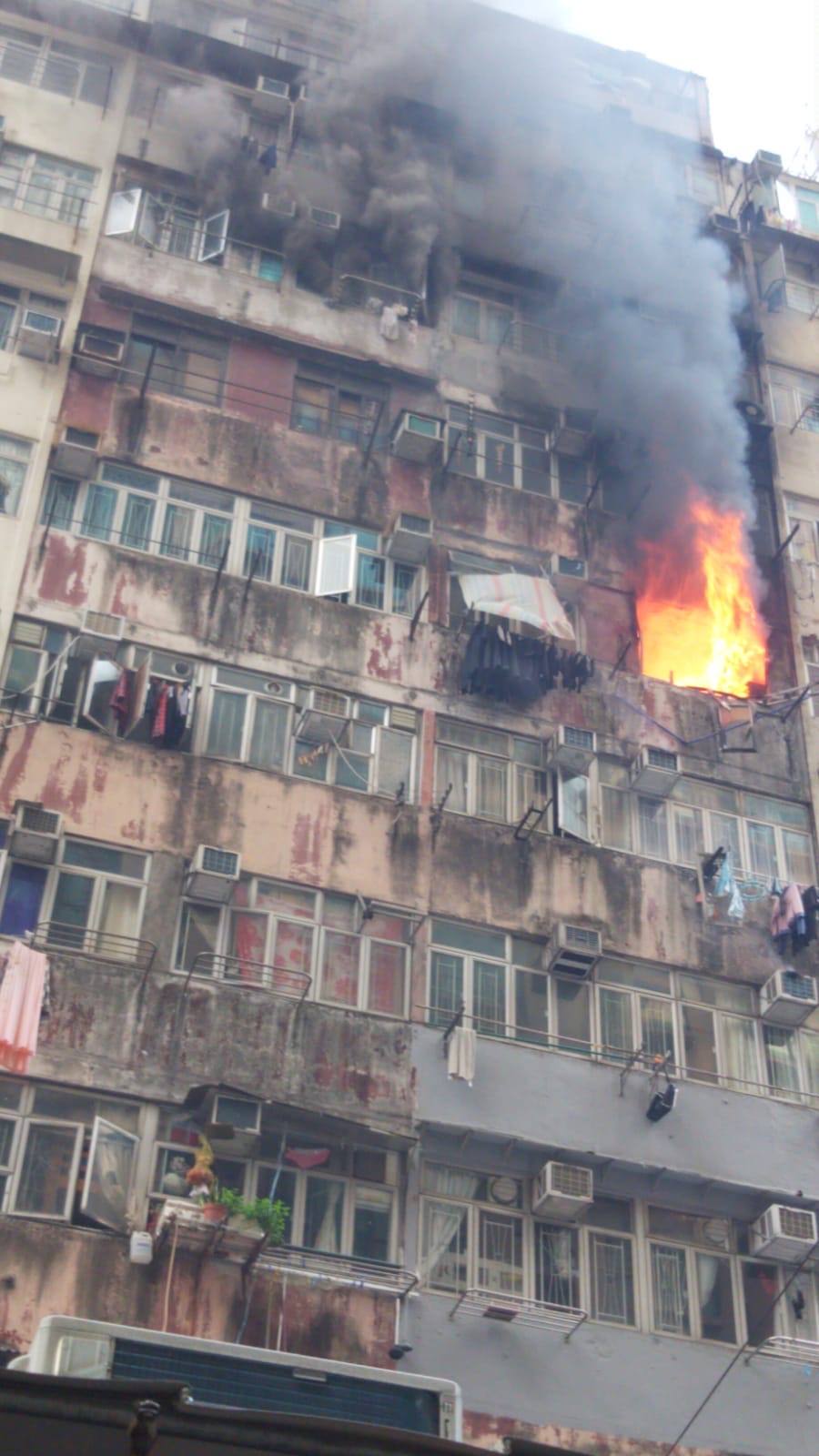 昨日上午11時許,上址一房間突然起火,火勢猛烈,並傳出爆炸聲,火舌冒出窗外,波及樓上單位玻璃窗亦爆裂,濃煙直捲半空。途人發現起火紛紛走避,起火單位的窗框被燒毀,1部冷氣機疑難抵熱力甩脫,飛墮樓下,幸未擊中途人,有住客見狀自行逃生及報警求救。