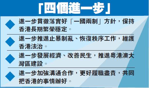 雙方都談到,要按照中央要求,進一步貫徹落實好「一國兩制」方針,保持香港長期繁榮穩定;進一步推進止暴制亂、恢復秩序工作,維護香港法治;進一步發展經濟、改善民生,推進粵港澳大灣區建設;進一步加強溝通合作,更好履職盡責,共同把香港的事情辦好。雙方堅信,有中央對香港的高度重視和關心,有強大祖國作堅強後盾,有香港社會各界的共同努力,香港一定能重回正軌,再創輝煌。