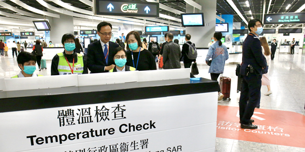 聶德權首先到達西九龍站香港口岸區,視察因應最新情況而採取的健康監察和衛生措施。他欣悉衛生當局已針對源頭加強防控工作,為每日兩班經武漢市到香港的高鐵列車上的入境旅客額外以手提式紅外線溫測儀檢查體溫,以期及早發現懷疑個案並作出跟進。衛生防護中心亦已增派人手,加強為其他入境旅客作體溫監測,並於站內入境大堂增設衛生站,向旅客派發健康資訊單張,解答他們的疑問。