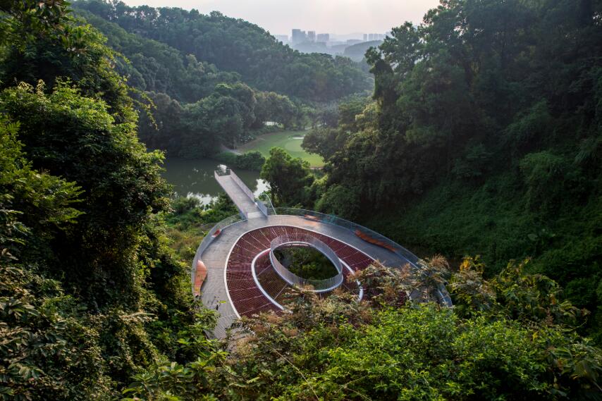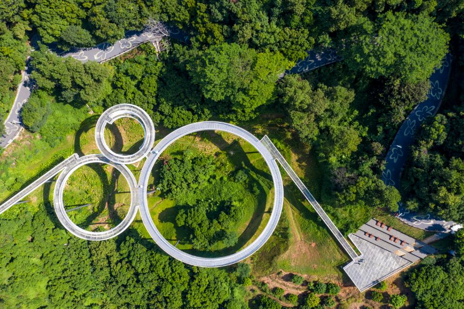 綠道面層採用灰色透水瀝青打造原生態路面,融於周邊環境,採用原木圍欄取代鐵絲圍欄,使綠道與山野環境更加和諧。對於山間、田間、與機動車共享的不同類型綠道,也因地制宜做了很多差異化的設計。特別引入發光路面,採用獨特的發光石設置極具創意的發光綠道,來增強綠道體驗的趣味性。綠道沿線還特別布置了與眾不同的智慧路燈,具有媒體廣播、視頻播放等功能,將線路指示、天氣、人流量、安全預警等信息清晰地顯示在燈桿上,讓遊客能在第一時間掌握綠道上的基礎信息。綠道的設計亮點除了因地制宜、一區一景的穿行景觀外,還有綠道上的三個核心節點——「三橋」。包括浮橋、探橋和懸橋,這三橋的立意,源自於對人與自然如何共融共生的思考而來。