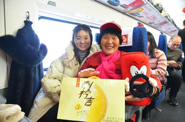 发车仪式结束后,南北两地的返乡人员带着主办方的祝福,秩序井然地步入候车大厅,踏上王老吉“让爱吉时回家”爱心高铁。车厢被装点一新,窗户上贴满喜庆的窗花、桌上摆上爱心礼包,整个车厢春节氛围浓郁。载着满满关爱和温暖的列车准时启程,朝着家的方向疾驰。忙碌了一年,踏上爱心高铁,即将返乡的旅客们更是心情舒畅,热情高涨,工作人员还设置了唱歌、飞花令等游戏环节,使车厢内欢声如潮。