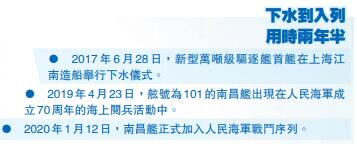 2017年6月28日,中國新型萬噸級驅逐艦首艦舉行下水儀式。2019年4月23日,舷號為101的南昌艦穿雲破霧,出現在中國海軍成立70周年的海上閱兵活動中。從下水到此次正式入列,南昌艦僅僅用了兩年半時間。