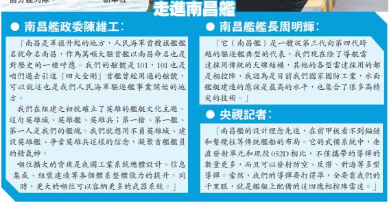 「它(南昌艦)是一艘從第三代向第四代跨越的驅逐艦典型的代表,我們現在除了導航雷達採用傳統的天線結構,其他的各型雷達採用的都是相控陣,我認為是目前我們國家國防工業,水面艦艇建造的應該是最高的水平,也集合了很多高精尖的技術。」