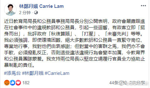 林郑月娥昨日在社交网站提到,近日教育局局长杨润雄、公务员事务局局长罗智光分别公开表明,政府会严肃跟进在社会事件中的违规教师和公务员,此举引起一些回响,有政客立即“挺身而出”,批评政府“秋后算帐”、“打压”、“未审先判”等等。