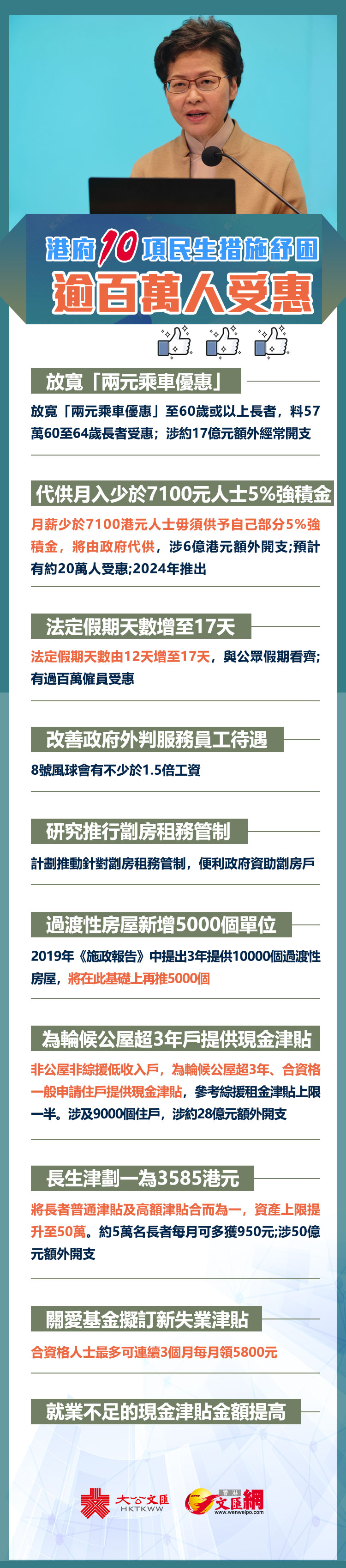 工聯會理事長黃國表示,全港僱員逐步實施一年17天有薪年假及代低薪者供強積金等是工聯會爭取多年的政策。而為失業基層人士提供3個月的現金津貼,顯示政府直面因社會事件而市道下行風險中基層勞工的急需,體現政府急市民所急,是施政為民的改進。
