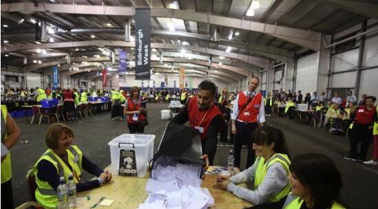 资料图:当地时间2014年9月18日,在苏格兰爱丁堡的投票站,公投委员在投票结束后进行统计工作。
