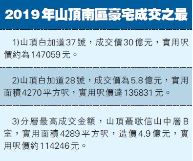 去年山頂南區一手成交錄得22宗,較2018年20宗上升10%,成交金額達到52.69億元,較2018年102.5億元跌48.4%。2019年下半年修例風波惡化,發展商靜觀其變,研究有效的銷售方法及優惠,所以延後出售日期。總結山頂南區一手及二手市場合共錄得135宗成交,成交金額達到208.96億元,成交宗數較去年156宗下跌13.5%,成交金額較去年302.42億元跌30.9%。