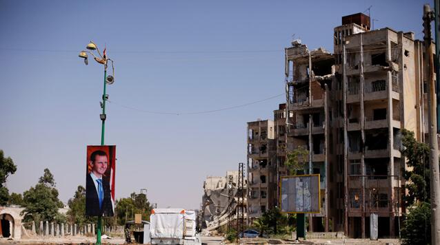 被袭击过的叙利亚霍姆斯市瓦尔区悬挂的叙利亚总统阿萨德头像。路透社