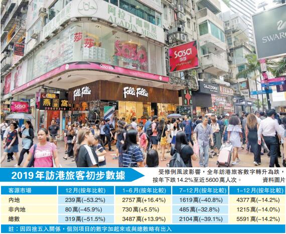另外,據旅發局初步統計數字顯示,上半年整體訪港旅客總數為3,487萬人次,按年增長13.9%,但受社會事件影響,旅客數字自7月起下跌,隨後的月份跌勢加劇,下半年整體訪港旅客總數2,104萬人次,按年下跌39.1%,全年整體訪港旅客總數為5591萬人次,按年跌幅高達14.2%。至於各客源市場方面,全年訪港旅客均出現下跌,其中內地及短途市場分別下跌14.2%及18.7%,長途及新市場則下跌12.7%至13.5%。2019年整體訪港過夜旅客則有2376萬人次,按年下跌18.8%。