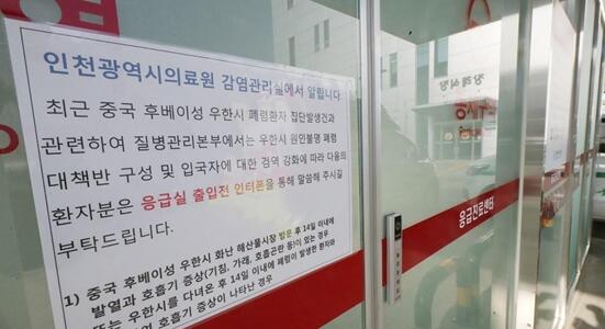 1月20日,仁川医疗中心急诊室入口贴着有关武汉肺炎疫情的提醒指南。当天,一名中国籍女性被确诊感染新型冠状病毒肺炎,该患者正在仁川医疗中心负压病房接受隔离治疗。韩联社