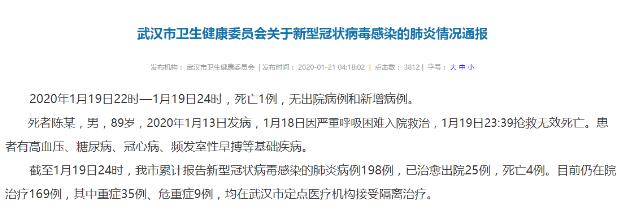 通報指出,截至1月19日24時,武漢市累計報告新型冠狀病毒感染的肺炎病例198例,已治愈出院25例,死亡4例。目前仍在院治療169例,其中重症35例、危重症9例,均在武漢市定點醫療機構接受隔離治療。