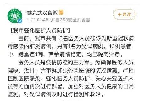 武漢市衛生健康委21日淩晨通過健康武漢官微通報,武漢市共有15名醫務人員確診為新型冠狀病毒感染的肺炎病例,另有1名為疑似病例。