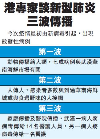 同日,袁國勇與衛生署衛生防護中心總監黃加慶、醫院管理局質素及安全總監鍾健禮會見記者時表示,今次疫情由新病毒引起,最初出現散發性病例,其後出現第一波傳播,當中七成病例與武漢華南海鮮市場有關,由動物傳播給人類;第二波傳播則圍繞華南海鮮城附近的兩個小區,相信多數是「人傳人」,感染者多數與到過華南海鮮城或與食過野味的人接觸;目前疫情可能已進入第三波,出現家庭傳播及醫院傳播,其中武漢一名腦外科病人將病毒傳給14名醫護人員;另一間醫院有一名病人將病毒傳播給一名醫護。