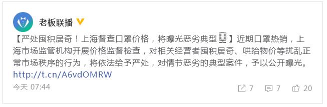 上海市场监管机构也开展价格监督检查,对相关经营者囤积居奇、哄抬物价等扰乱正常市场秩序的行为,将依法给予严处,对情节恶劣的典型案件,予以公开曝光。