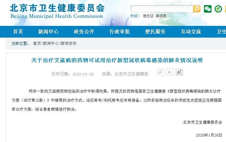 【香港商报网讯】1月26日凌晨,北京市卫健委发布关于治疗艾滋病的药物可试用治疗新型冠状病毒感染的肺炎情况说明。网传一款抗艾滋病药物在临床治疗中取得效果,所提及的药物是国家卫生健康委《新型冠状病毒感染的肺炎诊疗方案(试行第三版)》中推荐的治疗方式。洛匹那韦/利托那韦在京有储备。三所承担救治任务的市级定点医院正在根据国家诊疗方案,结合患者病情进行救治。