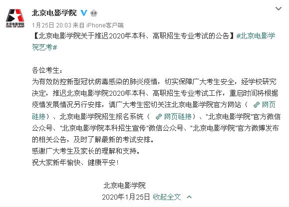【香港商报网讯】1月25日,北京电影学院发布公告称,为有效防控疫情,推迟北京电影学院2020年本科、高职招生专业考试工作。此前,中央美术学院、上海戏剧学院、北京舞蹈学院、上海音乐学院、上海视觉艺术学院、上海大学、清华大学美术学院等也陆续发布公告,推迟艺术类校考。