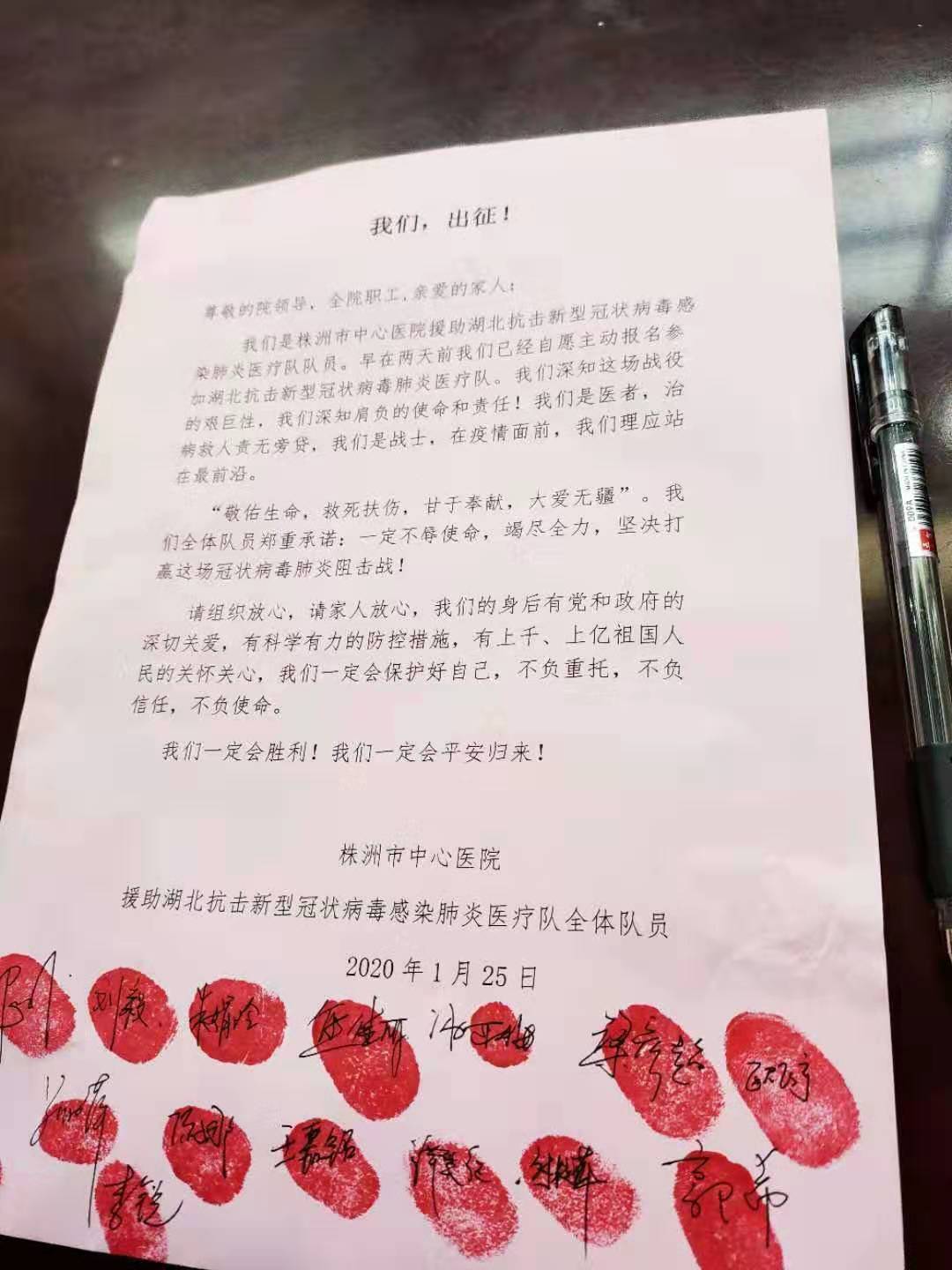 醫療救援隊副隊長、湖南省省直中醫院呼吸與危重症醫學科科室主任向毅1月23日遞交了請戰書,他說, 「我們深知這場戰役的艱巨性,我們深知肩負的使命和責任!愛人也很支持我!我們是醫者,是戰士,在疫情面前,我們理應站在最前沿。」